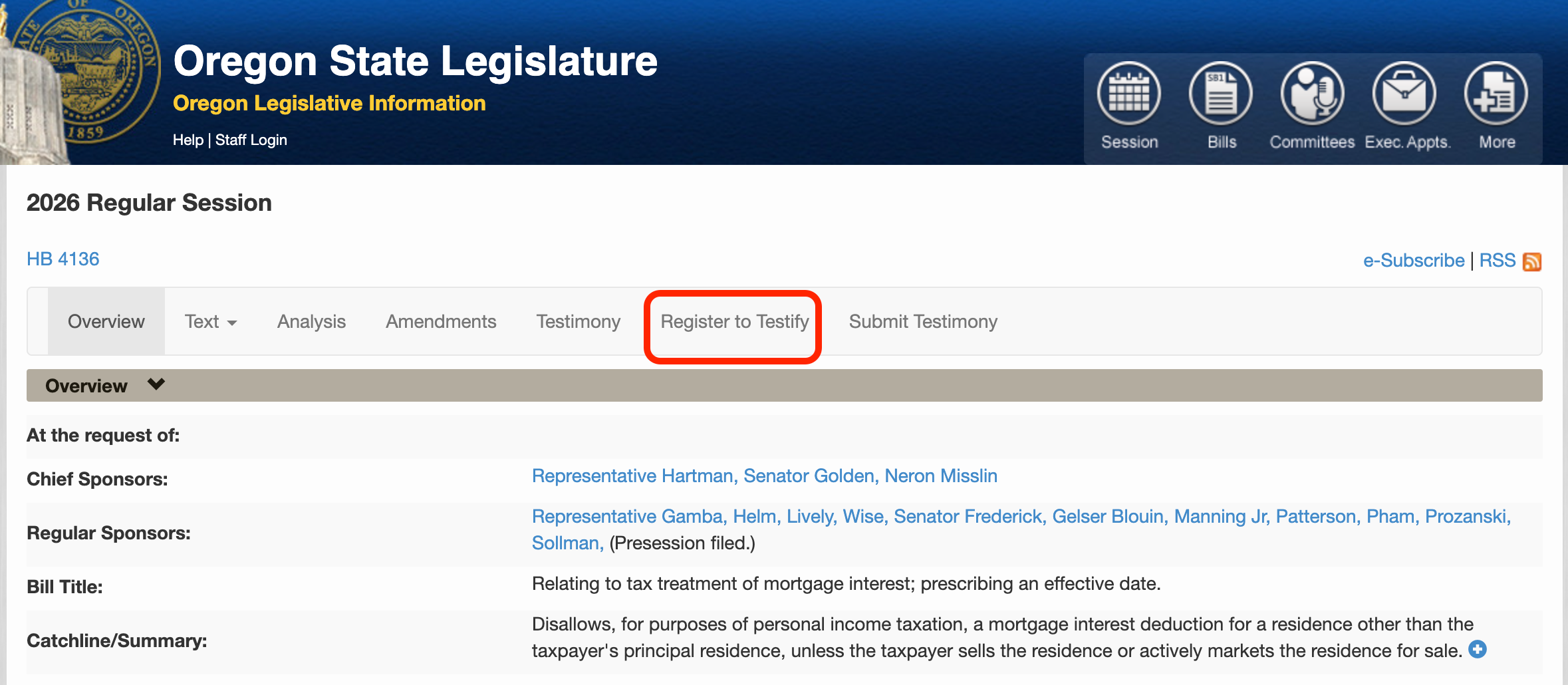 Click the image below or visit the Oregon State Legislature website and click on the “Register to Testify” tab (see image below) and choose “Oppose.”